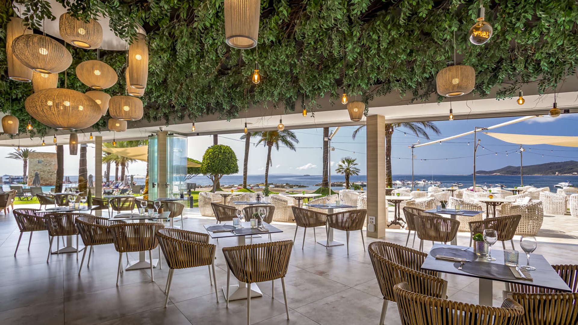 The Restobar Miramar is located outside the hotel, next to the garden with spectacular views of the sea. It is a perfect place to start the morning with an energetic late breakfast or any of our à la carte dishes, paired with a good wine or a cocktail. The opening hours are from 11:00 to 01:00 and the kitchen remains open until midnight. In addition, every noon and night you can enjoy a lunch or dinner enlivened with excellent live music.