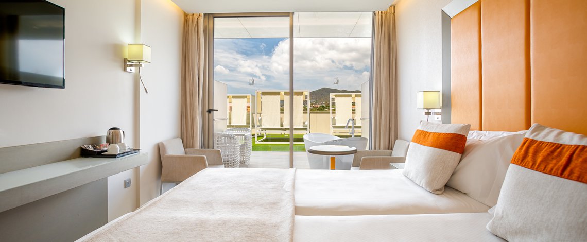 Terraza exterior con sillas, mesa, hamacas y bañera de hidromasaje.